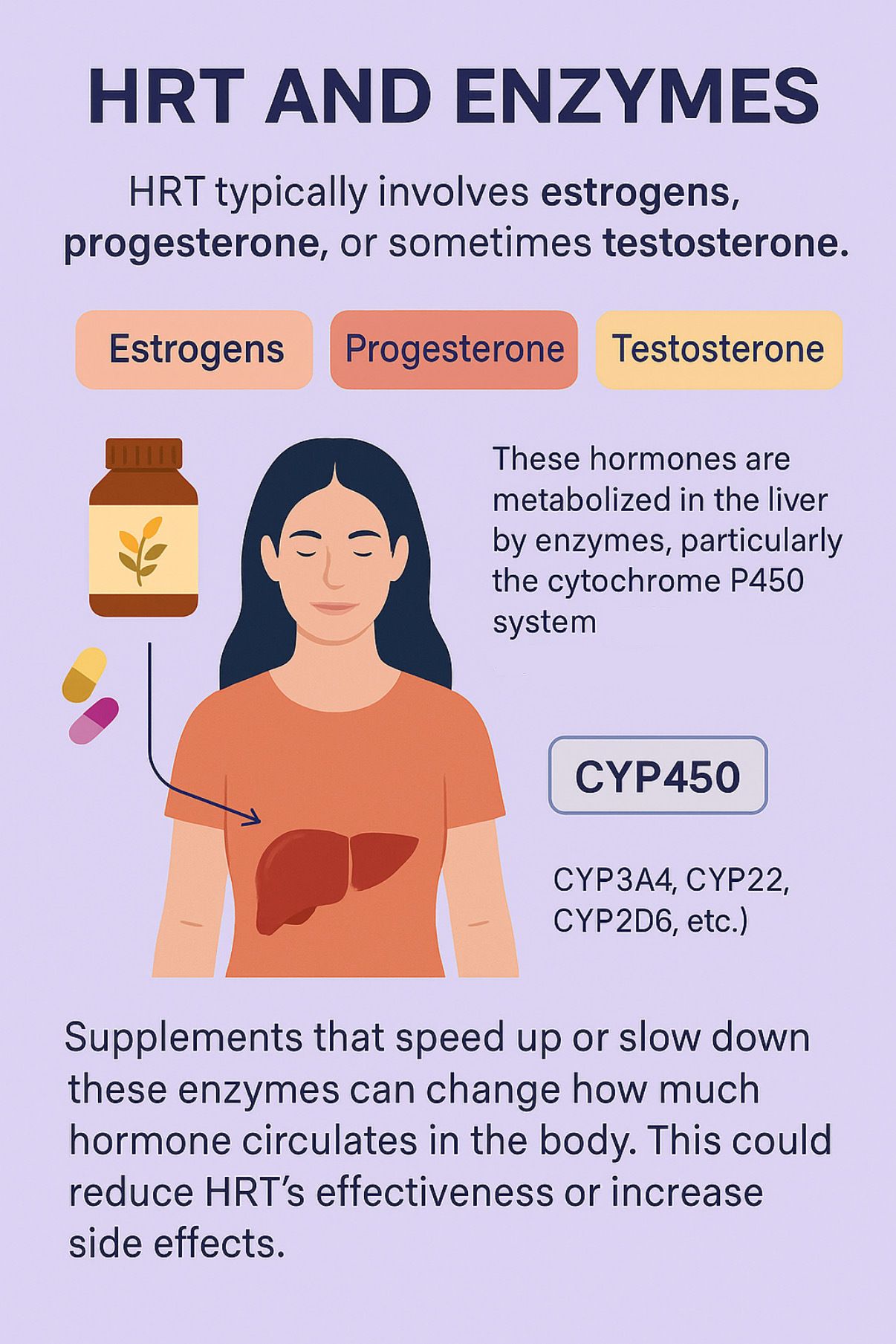 HRT typically involves estrogens, progesterone, or sometimes testosterone. These hormones are metabolized in the liver by enzymes, particularly the cytochrome P450 system (CYP3A4, CYP2C9, CYP2D6, etc.). Supplements that speed up or slow down these enzymes can change how much hormone circulates in the body. This could reduce HRT’s effectiveness or increase side effects.